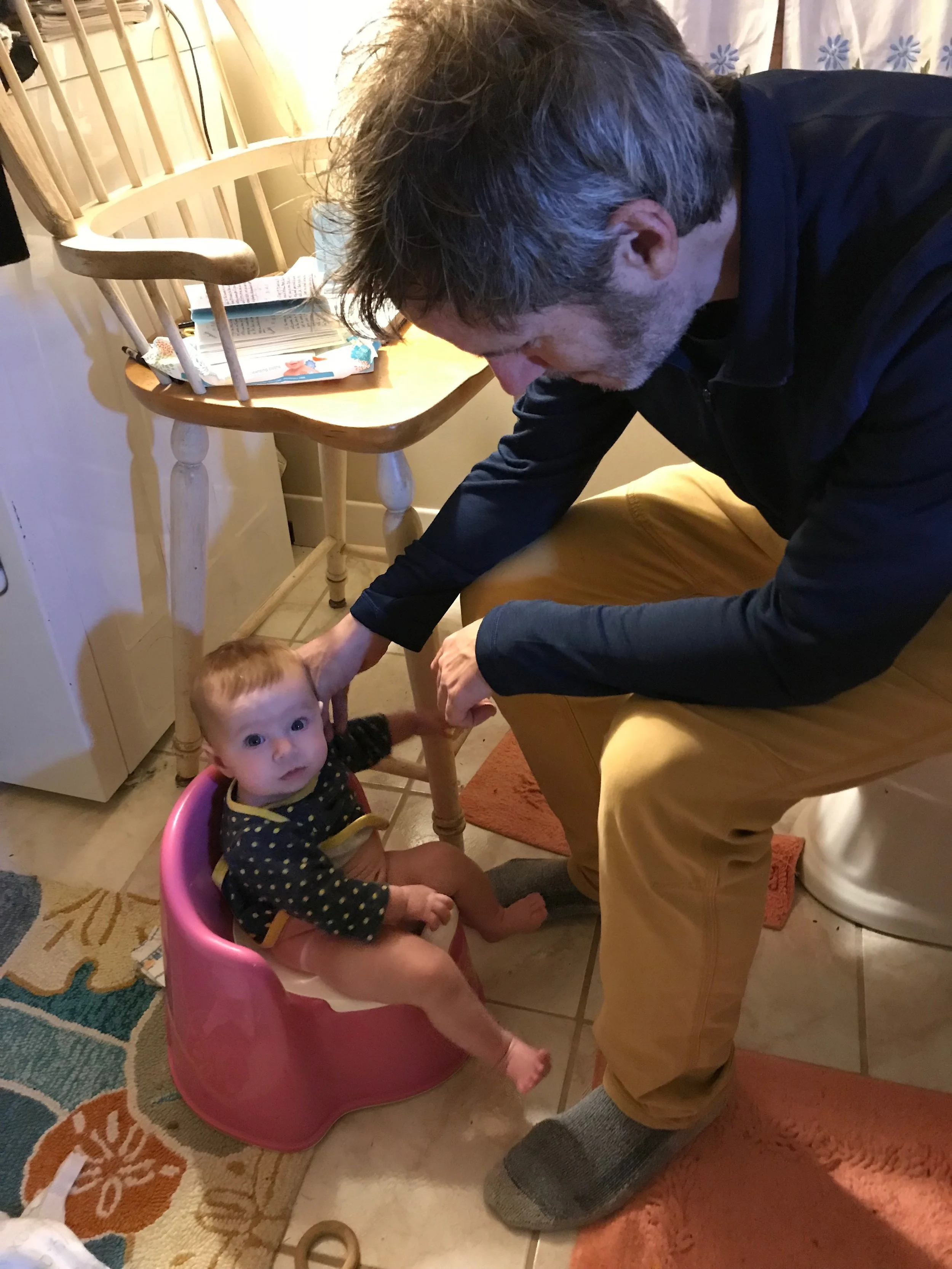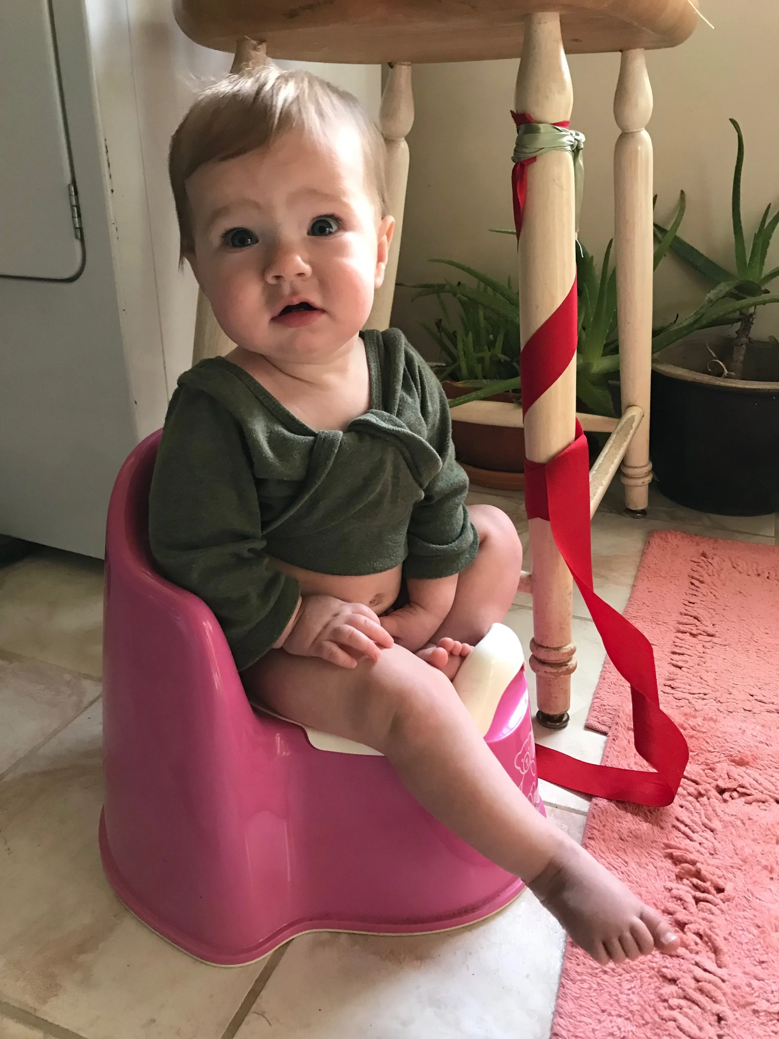 We started putting our baby on the potty when she was 4 months old. I didn’t plan to do this but one day I found a Baby Bjorn potty at the end of our neighbors driveway so I brought it home, cleaned it up and typed these words into google “4 month old using potty?” I got search results for something called “Elimination Communication”. You can go down a pretty deep rabbit hole of fanatical potty training opinion when you begin researching this stuff so I’ll summarize for you. Yes it’s totally possible to teach an infant to use the potty. No you don’t need to wait until the baby “shows signs of toilet readiness”, No you don’t have to be a hardcore cloth diapering mother to begin using this amazing technique! The guidelines are actually incredibly simple. You just plop them onto the potty at advantageous moments and see what happens.