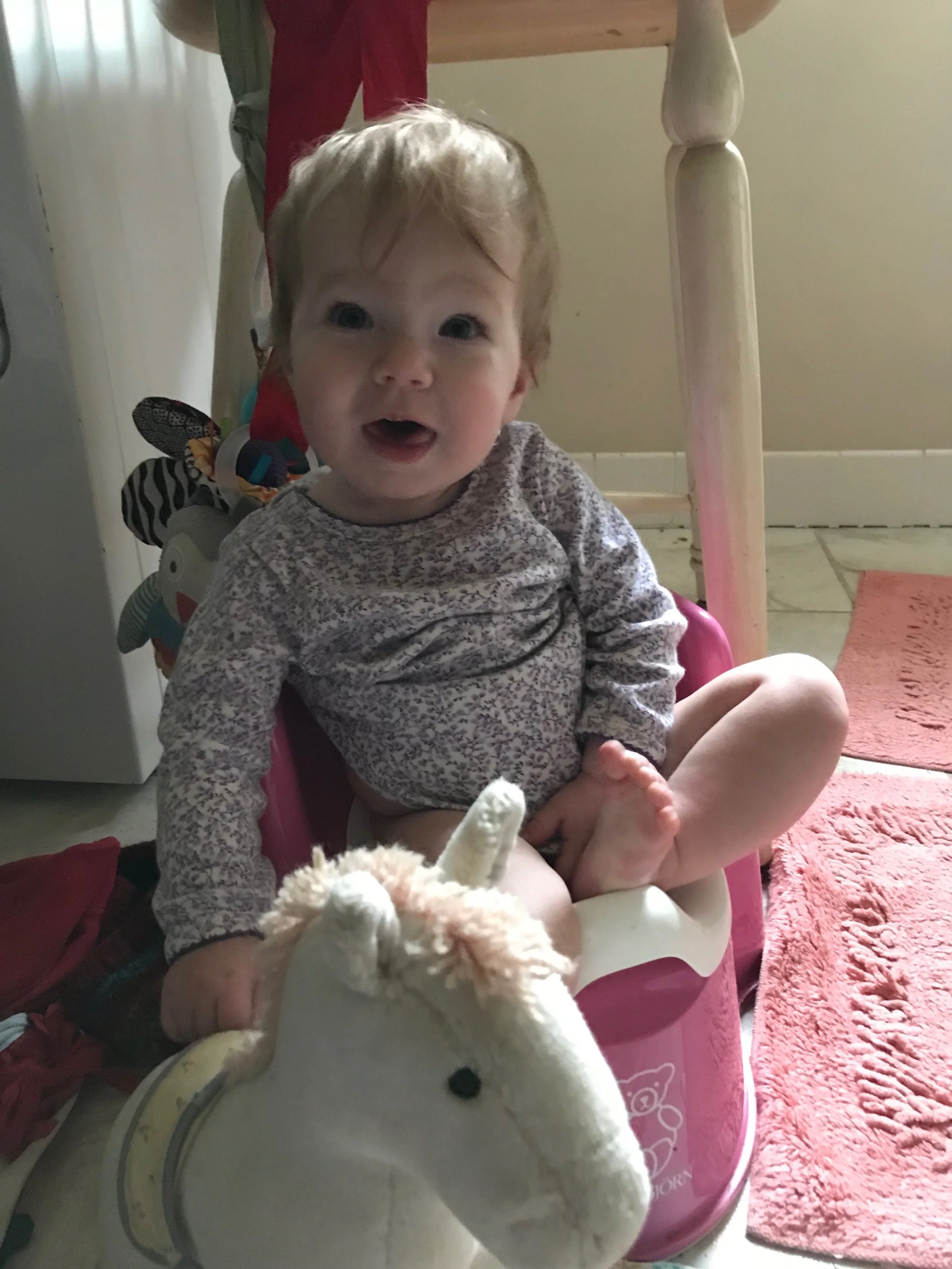 around 8 or 9 months she sometimes got bored and cranky on the potty so we tied some toys on ribbons next to it and tried to make it exciting and interesting for her. Here she is at 10 months with her wind up music horse.